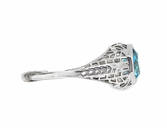 14K WHITE GOLD 7 MM ROUND EUROPEAN CUT BLUE ZIRCON VINTAGE ESTATE RING