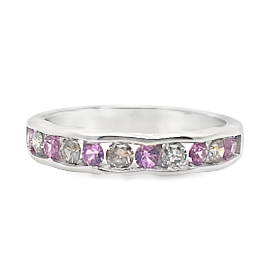 14K WHITE GOLD CHOCOLATE DIAMOND PINK SAPPHIRE WAVY BAND RING