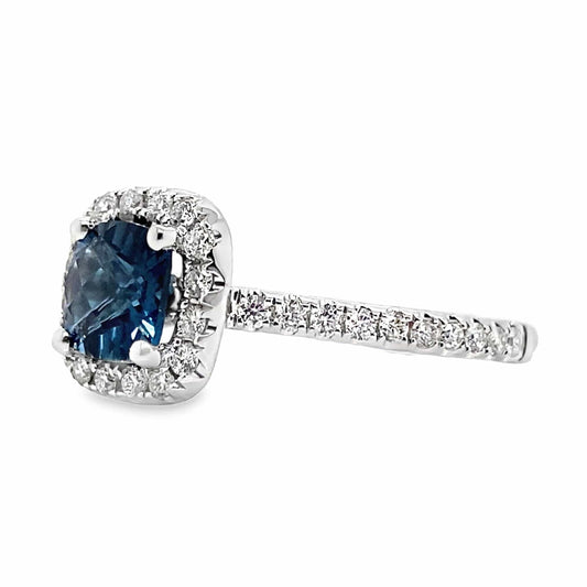 14K WHITE GOLD HALO DIAMOND RING, 1.35 CT PRINCESS & ROUND CUT