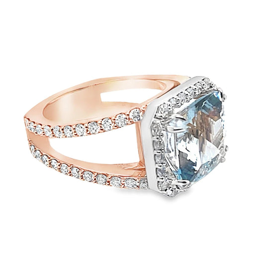 AQUAMARINE RING 5.95 CT 14K ROSE & WHITE GOLD WITH LAB DIAMONDS
