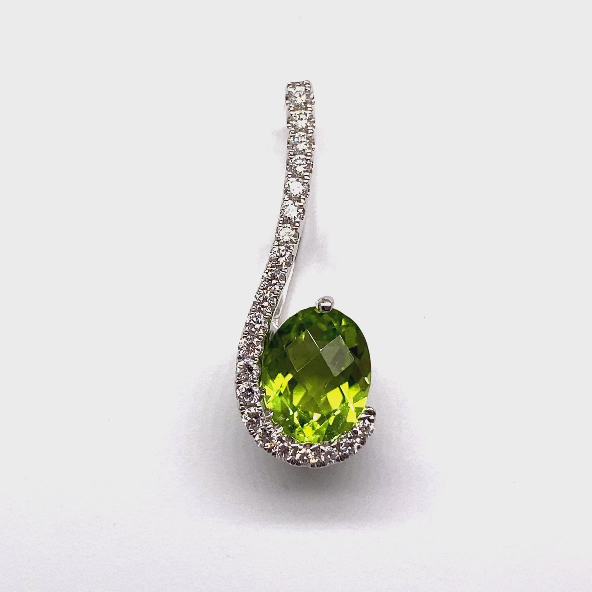 Explore our 1.95-carat Peridot ring, enhanced by 21 diamonds totaling 0.27 carats. This elegant piece blends vibrant green hues with timeless sparkle, perfect for any occasion.