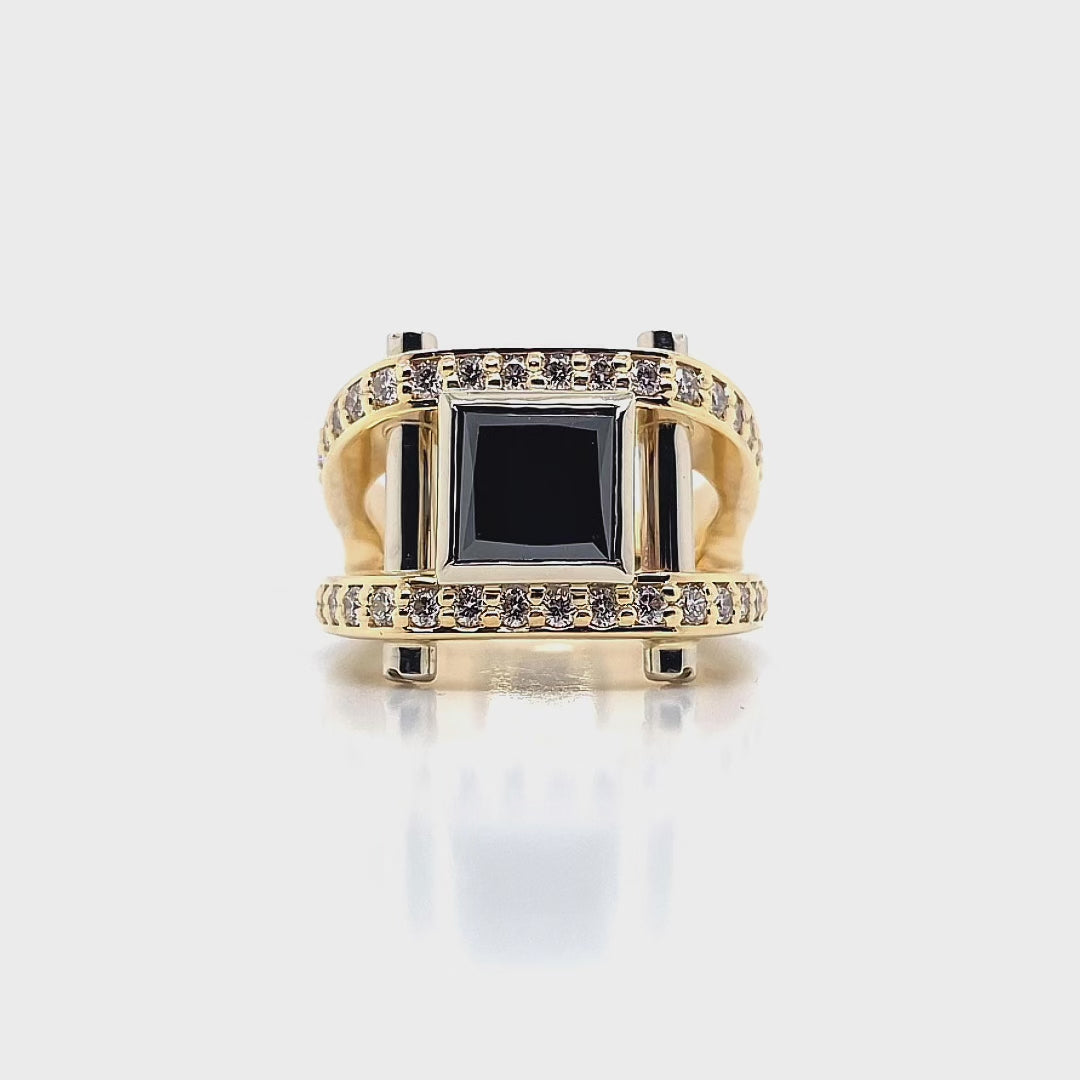 Bold. Edgy. Distinctly architectural. The Aiden is a custom creation that merges luxury with fearless design. At its core, a sleek, square-cut black diamond is bezel-set in white gold, framed by structural yellow gold rails that form a dynamic bridge-like silhouette. Dual bands—pavé-set with brilliant white diamonds—flow in angular symmetry around the gemstone, tapering toward a squared-off band for a masculine finish with modern precision.