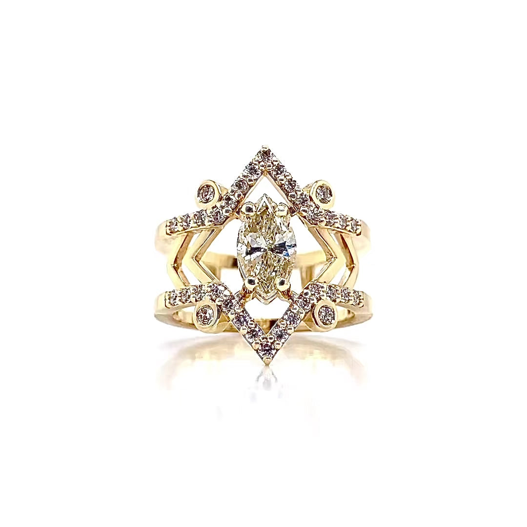 The Ashley is a radiant expression of strength, geometry, and unapologetic glamour. This custom-designed statement ring features a marquise-cut diamond at its heart—elongated and elegant—set within a bold, architectural frame of angular, star-like points. The structured 14K yellow gold band is split into three tiers, creating a dimensional silhouette that wraps the finger in brilliance. Accented with pavé-set natural diamonds and bezel-set round stones for added texture and sparkle, The Ashley commands attention from every angle. It’s more than jewelry—it’s a modern emblem of bold femininity.
