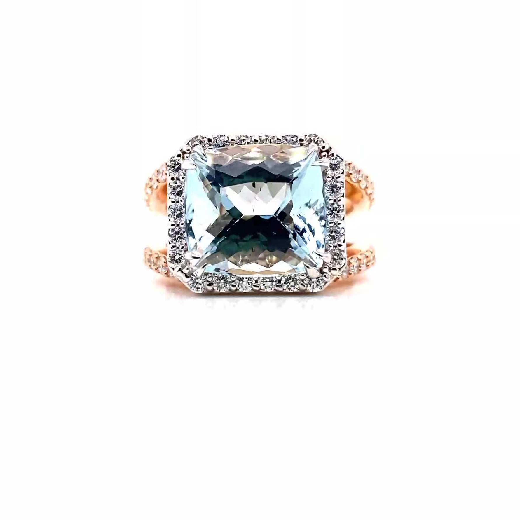 Effortlessly chic and undeniably glamorous, The Audrey is a modern heirloom designed to dazzle. At the center of this stunning ring lies a cushion-cut aquamarine, prized for its serene blue hue and luminous clarity. Framed by a delicate halo of white diamonds, the centerpiece is elevated further by a wide, split shank band crafted in warm rose gold and accented with rows of shimmering pavé diamonds.