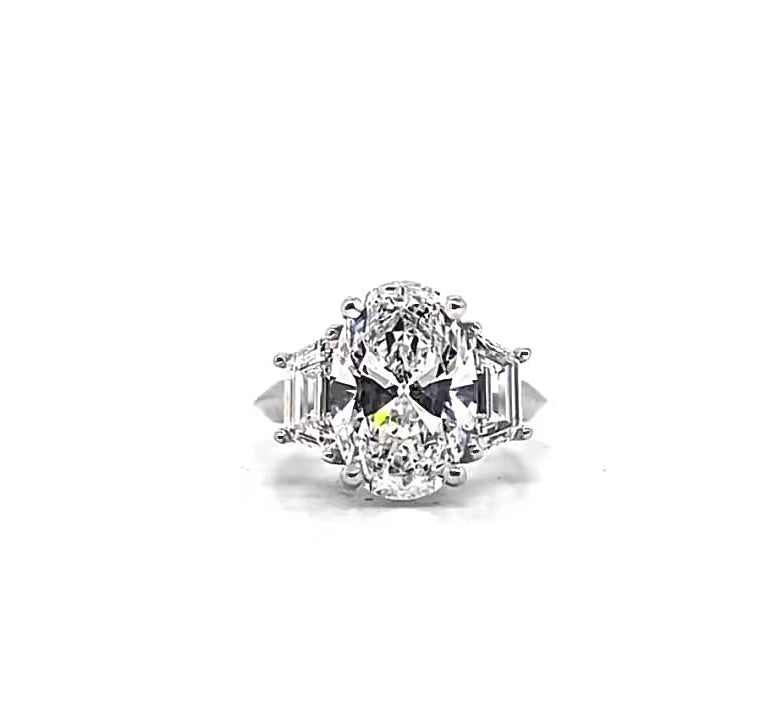 Bold, brilliant, and beautifully balanced — The Berry is a custom-designed three-stone ring that exudes timeless luxury. Handcrafted in sleek platinum, this design features a dazzling 3.01 ct oval-cut center diamond flanked by perfectly matched 1.45 ct trapezoid-cut diamond side stones. The clean lines and symmetry of the setting create a stunning visual effect, enhancing the brilliance of each diamond. Designed with sophistication in mind, The Berry is an exquisite celebration of love, legacy, and enduring elegance.