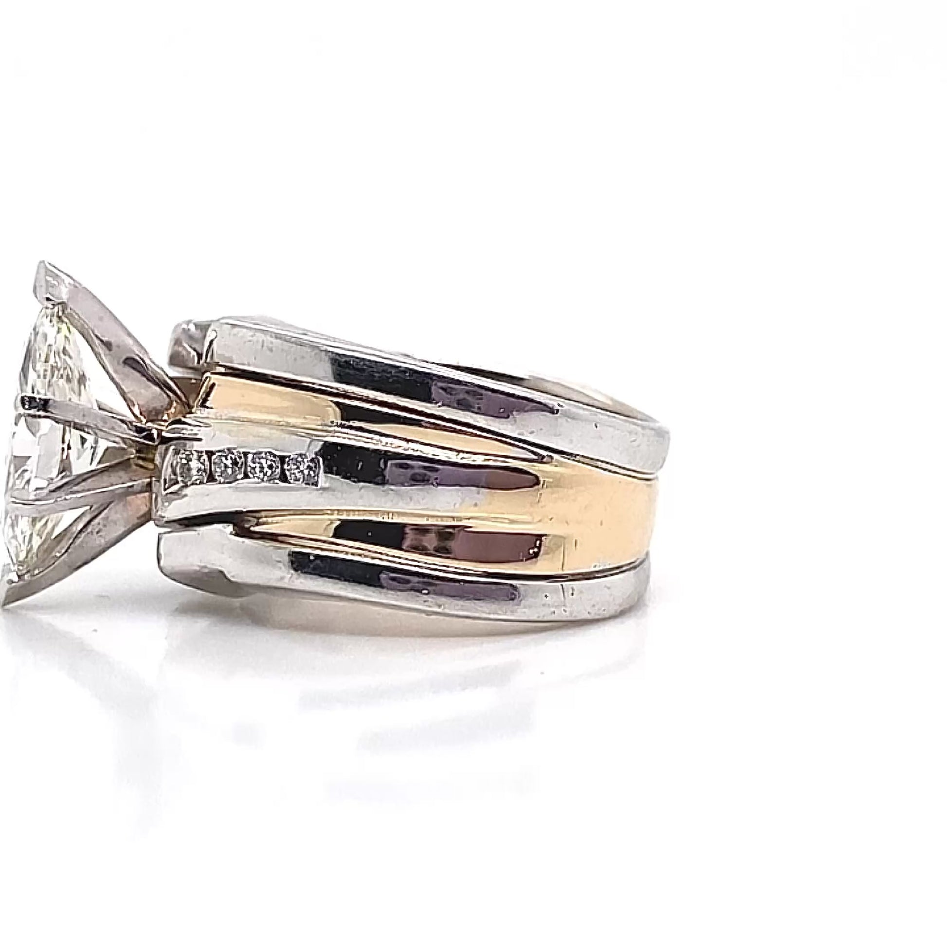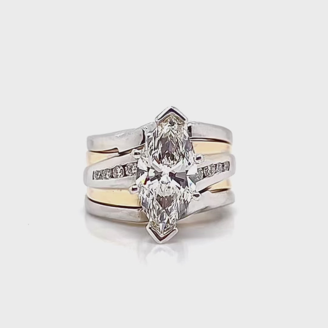 Introducing The Charlene — a bold and unforgettable custom ring set that beautifully merges classic elegance with contemporary design. At its center, a stunning 2.27ct marquise-cut diamond is securely held in a six-prong setting, showcasing its brilliance and elongating form. The striking two-tone design features intertwining bands of sleek white gold and rich yellow gold, creating dimension and contrast. Channel-set round diamonds accent the split-shank band, adding radiant sparkle and refined balance. The Charlene is a true statement piece—crafted for those who love timeless sophistication with a modern edge.