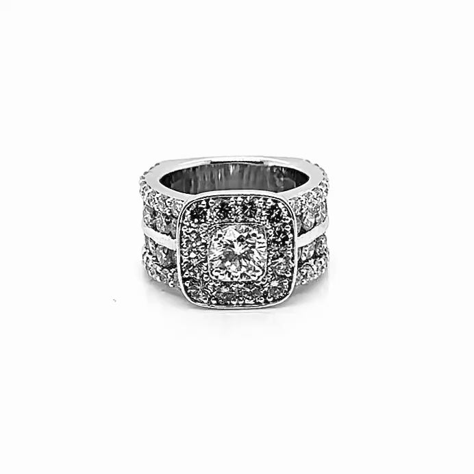 The Deborah is a bold and breathtaking expression of confidence, brilliance, and timeless glamour. This luxurious custom ring features a cushion-shaped diamond halo framing a radiant round center stone, all set in luminous 14K white gold. The wide band is adorned with three full rows of round brilliant diamonds, channeling light and sparkle from every angle. A sleek negative-space detail between the rows adds modern structure and visual intrigue.