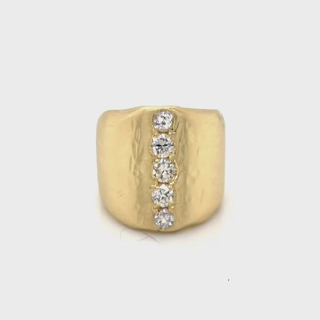 The Devin is where raw elegance meets bold craftsmanship. Hand-forged in rich 18K yellow gold, this wide-band ring features a subtly hammered texture that gives it an organic, sculptural quality. A vertical row of round natural diamonds—precision-set down the center—adds brilliance and balance, creating a striking contrast between the rugged finish and refined sparkle. Designed to stand alone or stack with confidence, The Devin is a modern heirloom that exudes strength, style, and authenticity.