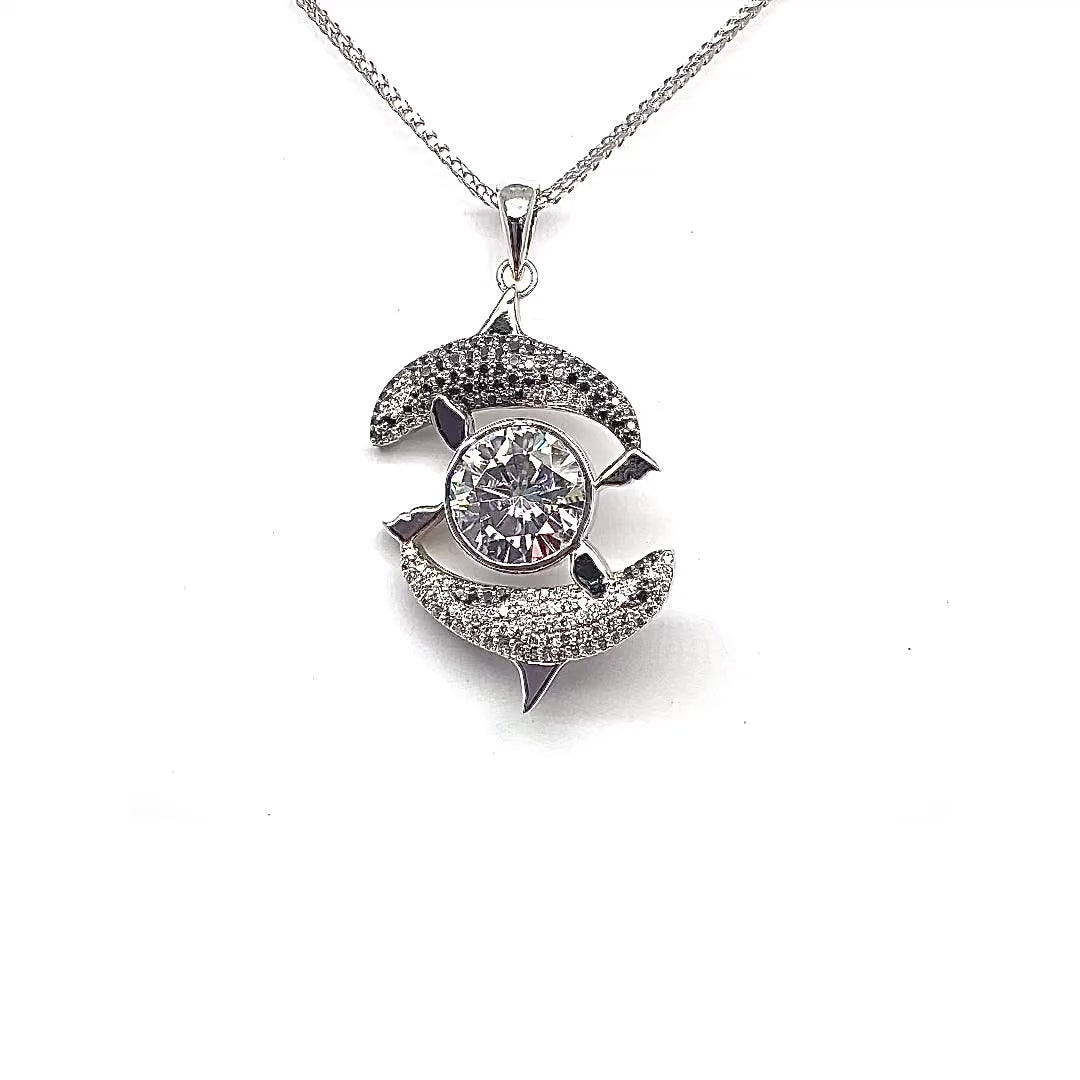 The Dolphin is a playful yet elegant tribute to the grace and harmony of the ocean. This unique pendant features two sculpted dolphins in gleaming white metal, their sleek bodies shimmering with pavé-set black and white stones. They circle around a brilliant round-cut center stone, capturing movement, fluidity, and unity in a mesmerizing design. Suspended from a classic chain, The Dolphin radiates both coastal charm and timeless sparkle—perfect for the free spirit who finds beauty in nature and strength in symbolism.