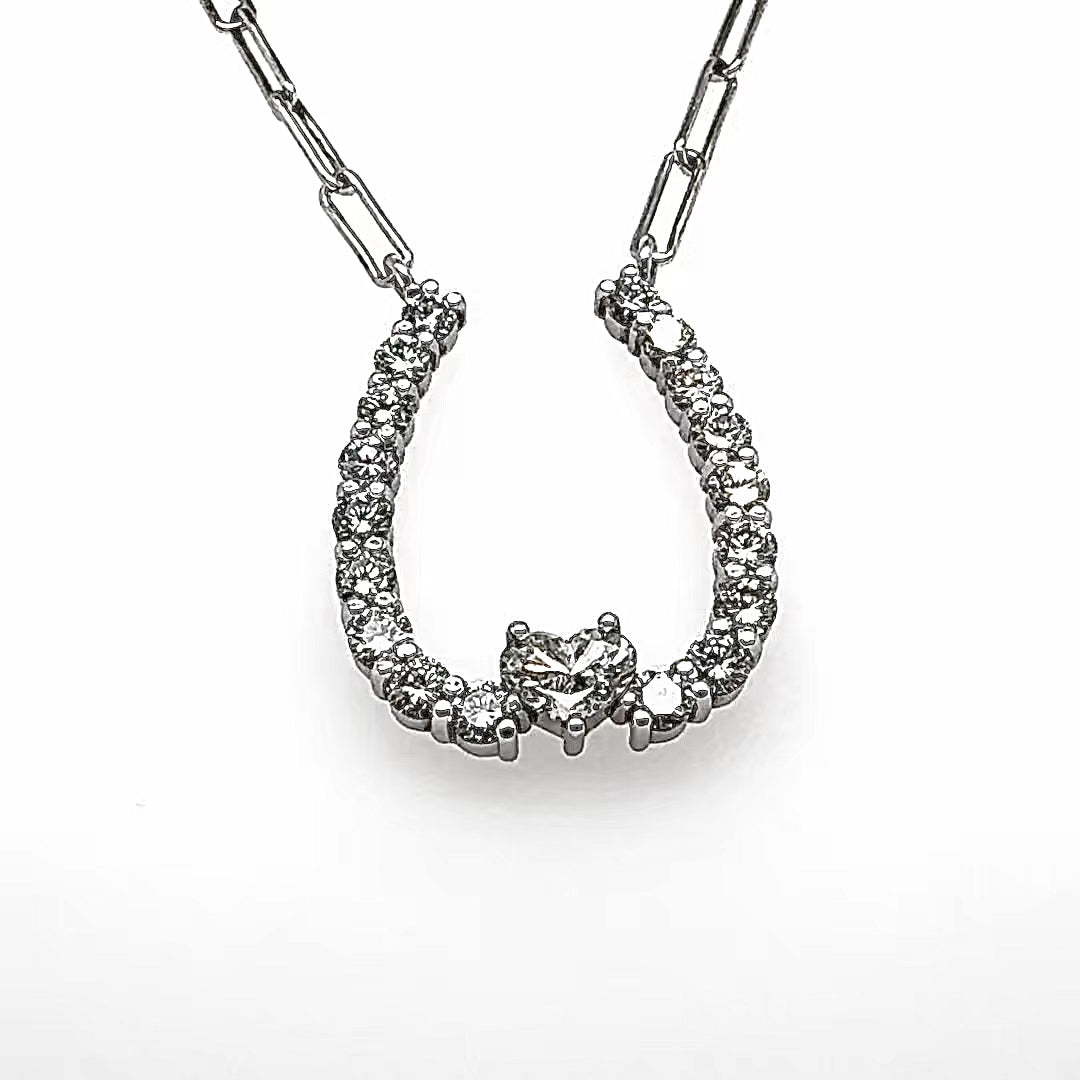 The Horseshoe Heart is a radiant symbol of love and luck, perfectly blended into one elegant design. This custom-crafted necklace features a graceful horseshoe silhouette, meticulously set with brilliant natural diamonds that sparkle with every movement. At the base rests a dazzling heart-shaped diamond, adding a romantic focal point to the timeless shape. Suspended from a sleek paperclip-style white gold chain, The Horseshoe Heart is both modern and meaningful—an everyday heirloom that brings charm and sentiment to your jewelry collection.
