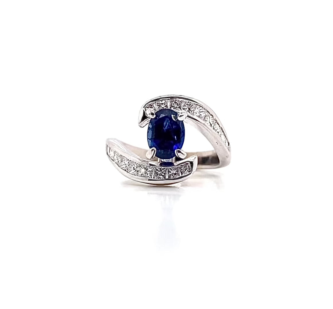 Introducing The Jane — a graceful custom bypass ring that embodies elegance, meaning, and refined design. At the center is a vivid 1.25ct oval natural blue sapphire, symbolizing wisdom and strength. Crafted in polished 14K white gold, the sculptural bypass band wraps gently around the center stone, channel-set with graduated princess-cut diamonds on each side for added brilliance and architectural flair. The Jane is a modern classic—perfect for marking milestones with beauty, balance, and timeless sophistication.
