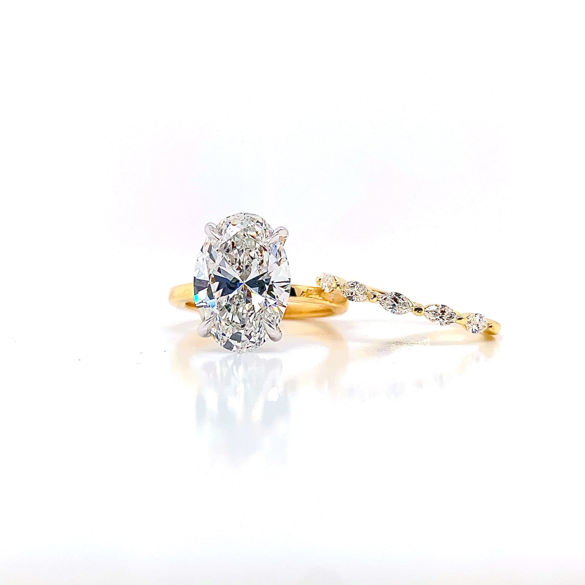 Introducing The Jasso — a custom-designed showpiece that redefines modern luxury. Crafted in 14k two-tone gold, this timeless solitaire ring showcases a breathtaking 5.51ct oval diamond (E/VVS), accented by a hidden halo for an added touch of brilliance. Paired with a distinctive East-to-West marquise diamond band, The Jasso is a bold and refined expression of elegance, thoughtfully created as a one-of-a-kind design.