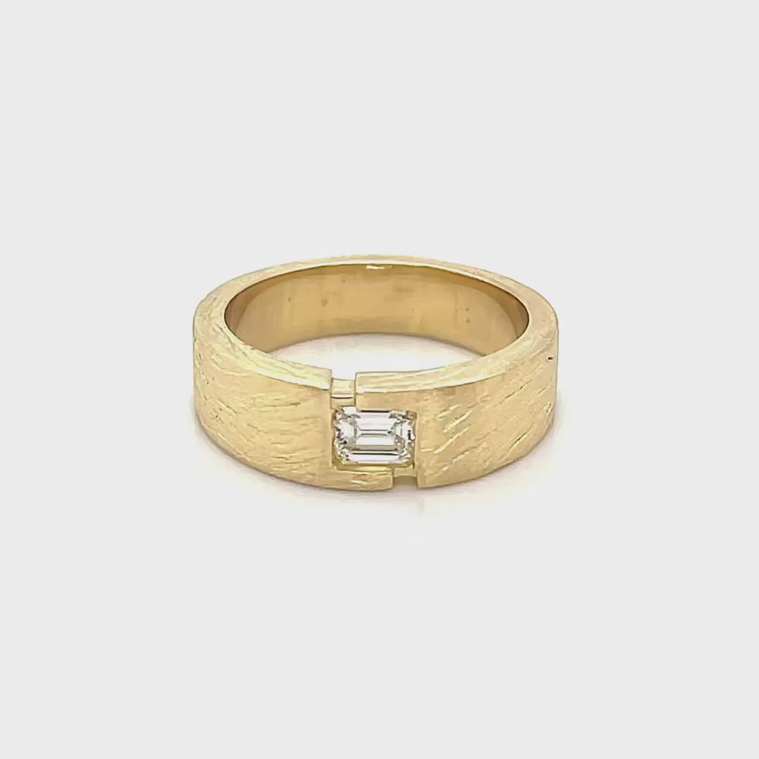 The Joseph is a refined interpretation of minimalism and strength. Crafted in 18K yellow gold with a matte-brushed finish, this custom-designed ring features clean lines and a striking architectural silhouette. At the center, a bezel-set emerald-cut natural diamond is seamlessly suspended between two beveled edges, adding a crisp flash of brilliance to the modern design. Sculptural, understated, and enduring, The Joseph makes a powerful statement without saying a word—perfect as a wedding band, fashion ring, or heirloom piece.
