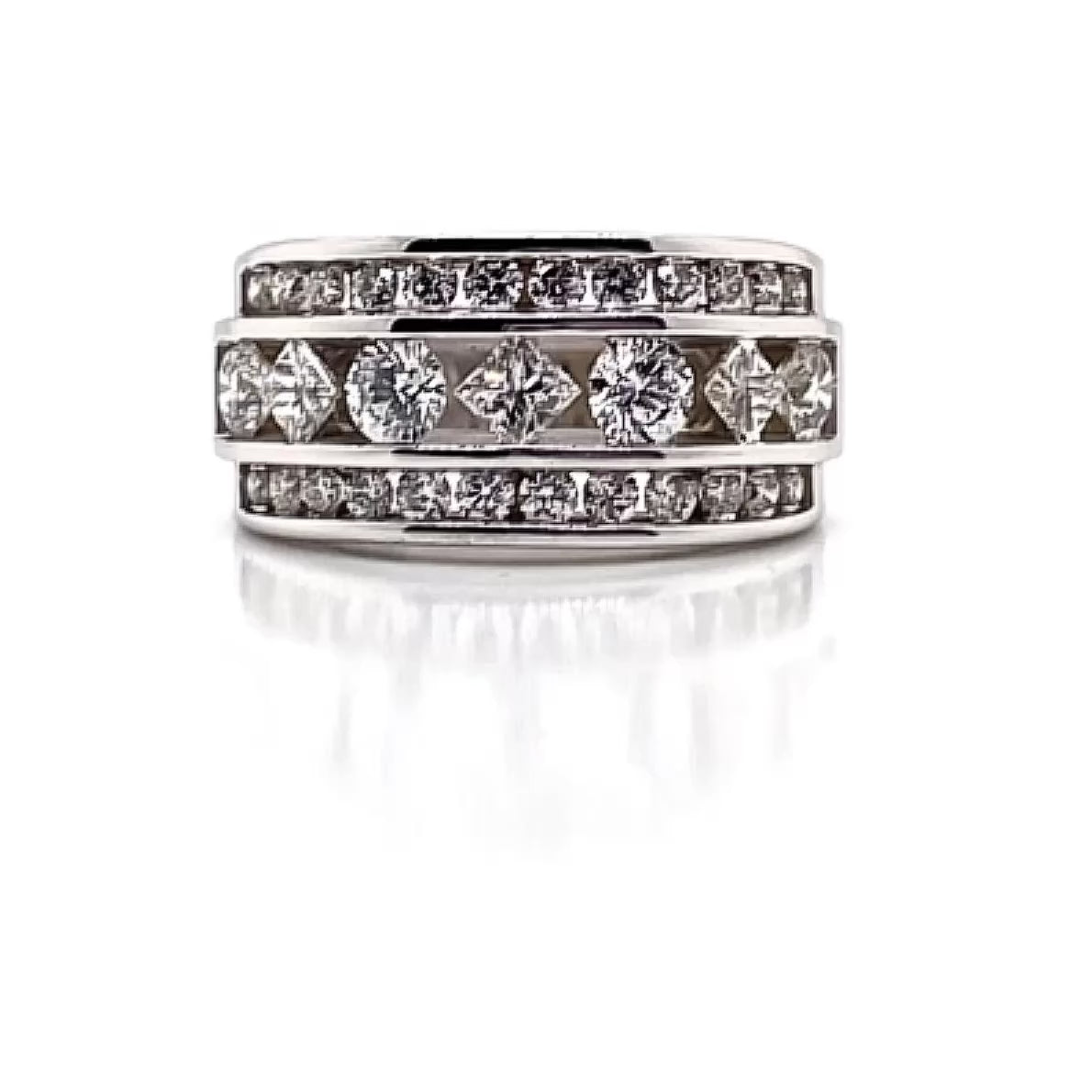 Introducing The Kaitlyn — a bold and sophisticated custom band designed to make a statement. Crafted in sleek white gold, this triple-row ring features a striking row of princess-cut diamonds set flush in a bold channel, flanked by two pavé-set rows of round brilliant diamonds. The clean lines and high-polish finish create a modern, architectural silhouette. Whether worn as a fashion-forward wedding band, a luxurious anniversary ring, or a standout statement piece, The Kaitlyn exudes strength, style, and timeless brilliance.