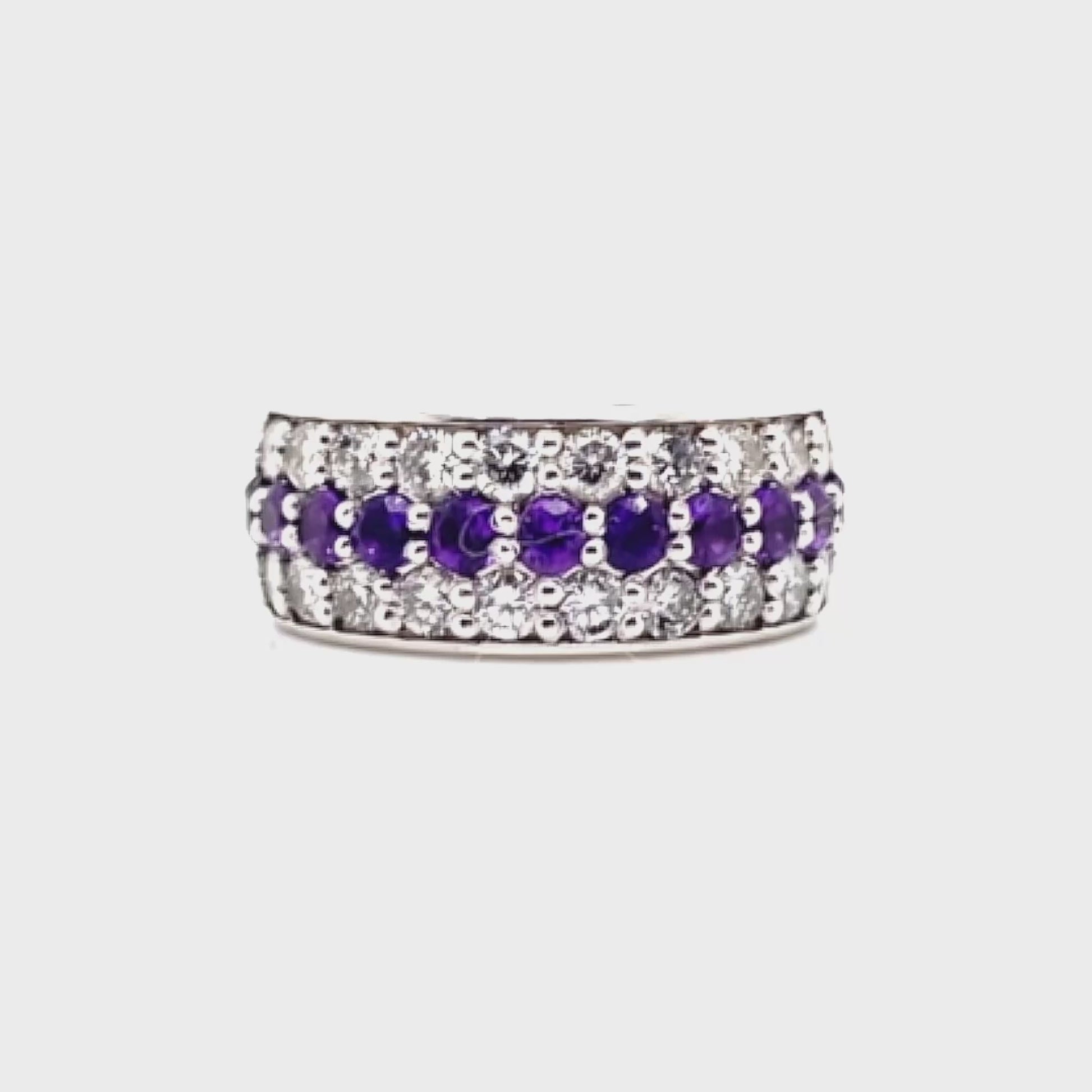 Introducing The Kendra — a bold and elegant custom band that radiates color and brilliance. This striking design features a vibrant row of deep amethyst gemstones, beautifully framed by two glittering rows of natural round diamonds. Crafted in lustrous white gold, The Kendra 1.0 blends vivid hues with classic sparkle, creating a timeless piece that makes a statement. Perfect as a luxurious anniversary band or a standout addition to any fine jewelry collection.