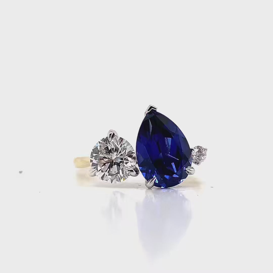 Introducing The Kristi — a stunning custom three-stone ring that celebrates color, elegance, and timeless design. At its heart is a captivating 3.07-carat pear-shaped lab-created sapphire, radiating deep royal blue tones. Flanking the center stone are two natural round brilliant diamonds—0.78ct and 0.40ct—that add perfect balance and sparkle. The Kristi is a bold and sophisticated statement piece, blending classic beauty with vibrant allure.