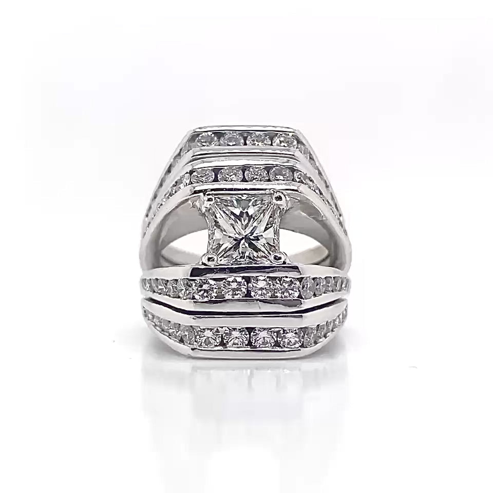 Introducing The Lina — a bold custom ring that blends architectural design with radiant sparkle. At its center, a brilliant princess-cut diamond is elevated above an intricate multi-band setting, each band encrusted with rows of round brilliant diamonds. Crafted in luminous white gold, The Lina showcases a striking silhouette that balances modern structure with luxurious elegance. It’s a showstopping piece for those who appreciate bold design and refined craftsmanship.