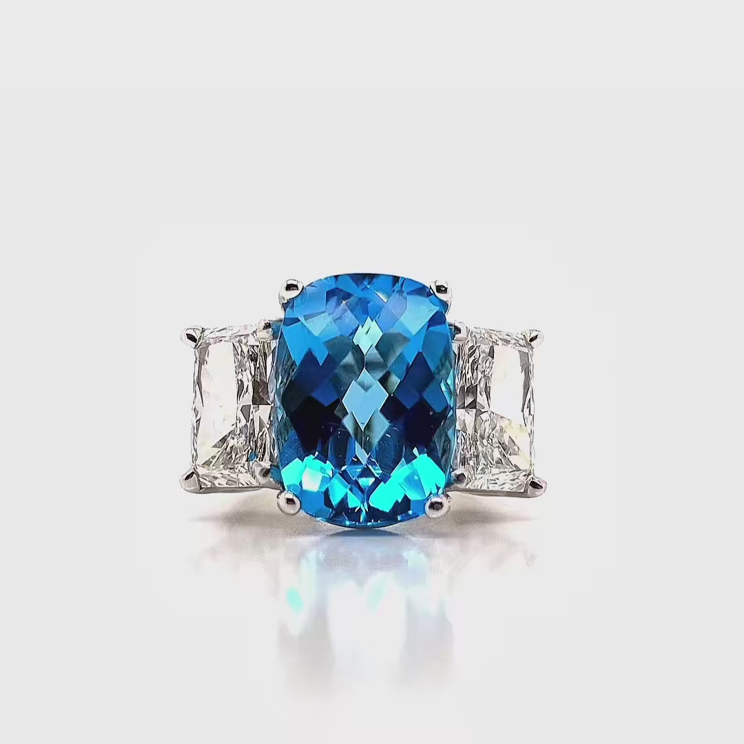 Command attention with The Lisa—a bold, yet elegantly balanced three-stone masterpiece. At its center, a mesmerizing 8-carat cushion-cut blue topaz radiates vivid brilliance, beautifully complemented by two icy white radiant-cut natural diamonds totaling 5 carats. Set in sleek white gold, this statement piece is the ultimate celebration of color, clarity, and confidence.