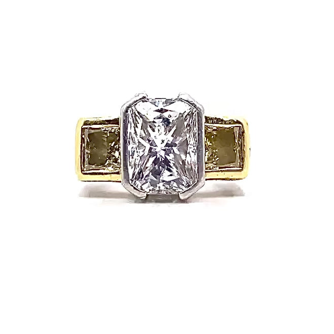 Introducing The Lorelei — a custom-designed masterpiece that brings together refined elegance and bold contrast. At its heart, a radiant emerald-cut diamond is flanked by golden bezels holding rich cognac-hued side stones, creating a striking interplay of tones. The band is hand-engraved with a detailed leaf motif, adding organic charm and vintage appeal to its architectural silhouette. Crafted in a mix of white and yellow gold, this ring blends modern artistry with classic romance — an extraordinary piece for a truly one-of-a-kind love story.