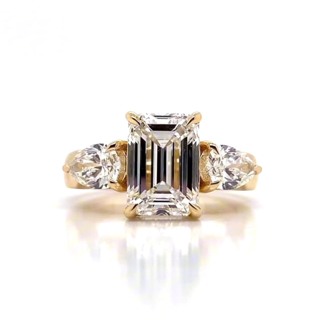 Introducing The Mandy — a breathtaking custom three-stone engagement ring designed to captivate. Crafted in rich 18K yellow gold, this elegant piece features a commanding 3.27 ct emerald-cut center diamond known for its clean lines and exceptional clarity. Flanked by perfectly matched pear-shaped 1.02 ct side stones, the design creates a graceful taper and timeless silhouette with a modern edge. The warmth of the yellow gold setting enhances both contrast and brilliance, making The Mandy a luxurious expression of refined beauty and bold sophistication.