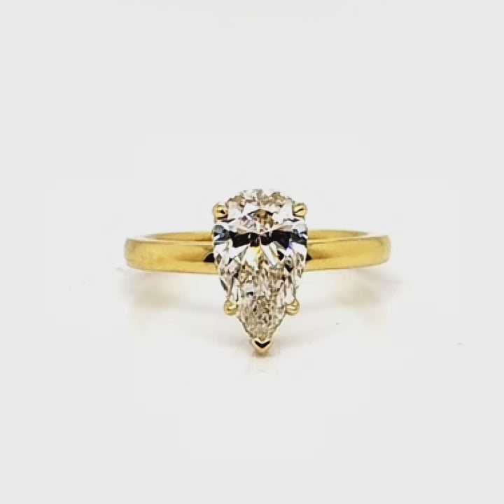 Introducing The Mia — a stunning custom engagement ring that exudes timeless sophistication. Crafted in luxurious 18K yellow gold, this elegant solitaire design features a captivating 1.70 carat natural pear-shaped diamond, securely set with a five-prong V-tip setting. A hidden halo of shimmering accent diamonds adds a touch of brilliance beneath the surface, while the graceful crossover under-gallery enhances the ring’s fluid and refined silhouette. Finished with a slender gold band, The Mia blends clean lines with radiant sparkle for a truly unforgettable piece. Designed in a size 6, this ring is the perfect symbol of love with a modern twist.