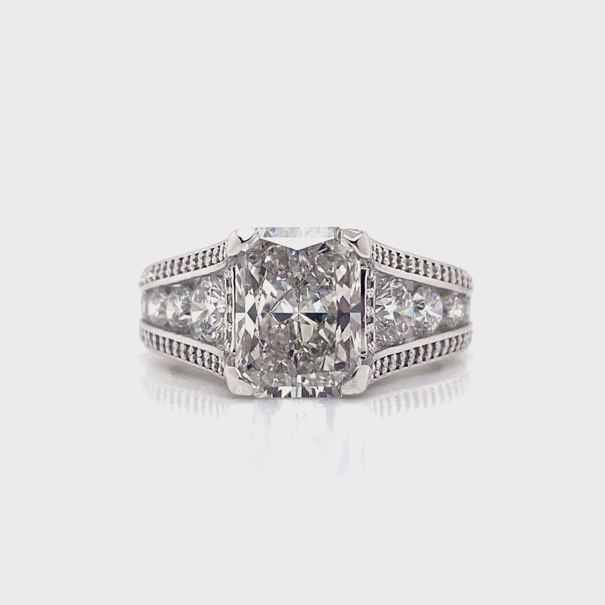 Introducing The Michelle — a luxurious custom ring that radiates brilliance, elegance, and timeless style. At its center shines a dazzling 2.50ct radiant-cut diamond, expertly set to capture and reflect light from every angle. The polished white gold band features graduated round brilliant diamonds that taper gracefully along the sides, creating a seamless shimmer. Finished with delicate milgrain detailing, The Michelle blends vintage refinement with bold modern design—perfect for an unforgettable engagement or milestone celebration.