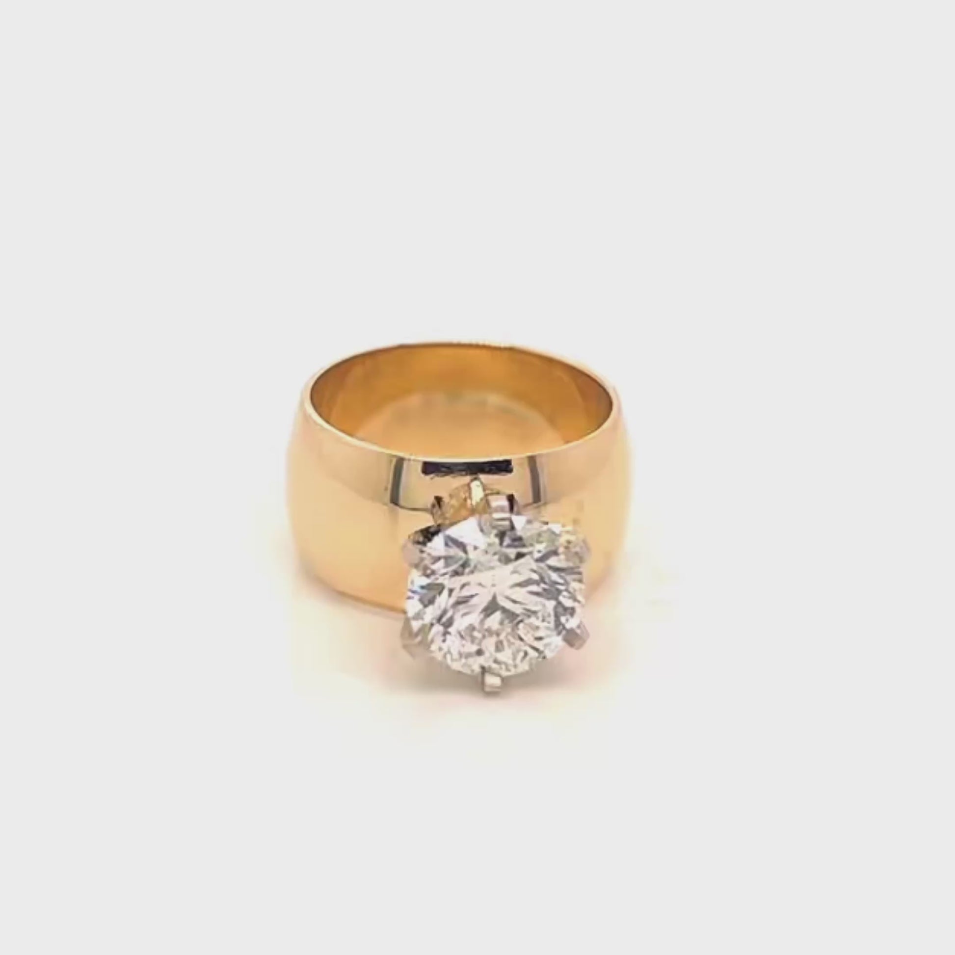 Introducing The Molly — a bold custom solitaire ring that blends minimalist design with modern luxury. Set in a wide, ultra-polished 18K yellow gold band, the brilliant 3.05 ct round brilliant cut diamond commands attention with its elevated setting and radiant sparkle. The substantial band offers a sleek, sculptural look that feels both contemporary and timeless. The Molly is a powerful statement piece—perfect for those who embrace clean lines, confident style, and refined craftsmanship.