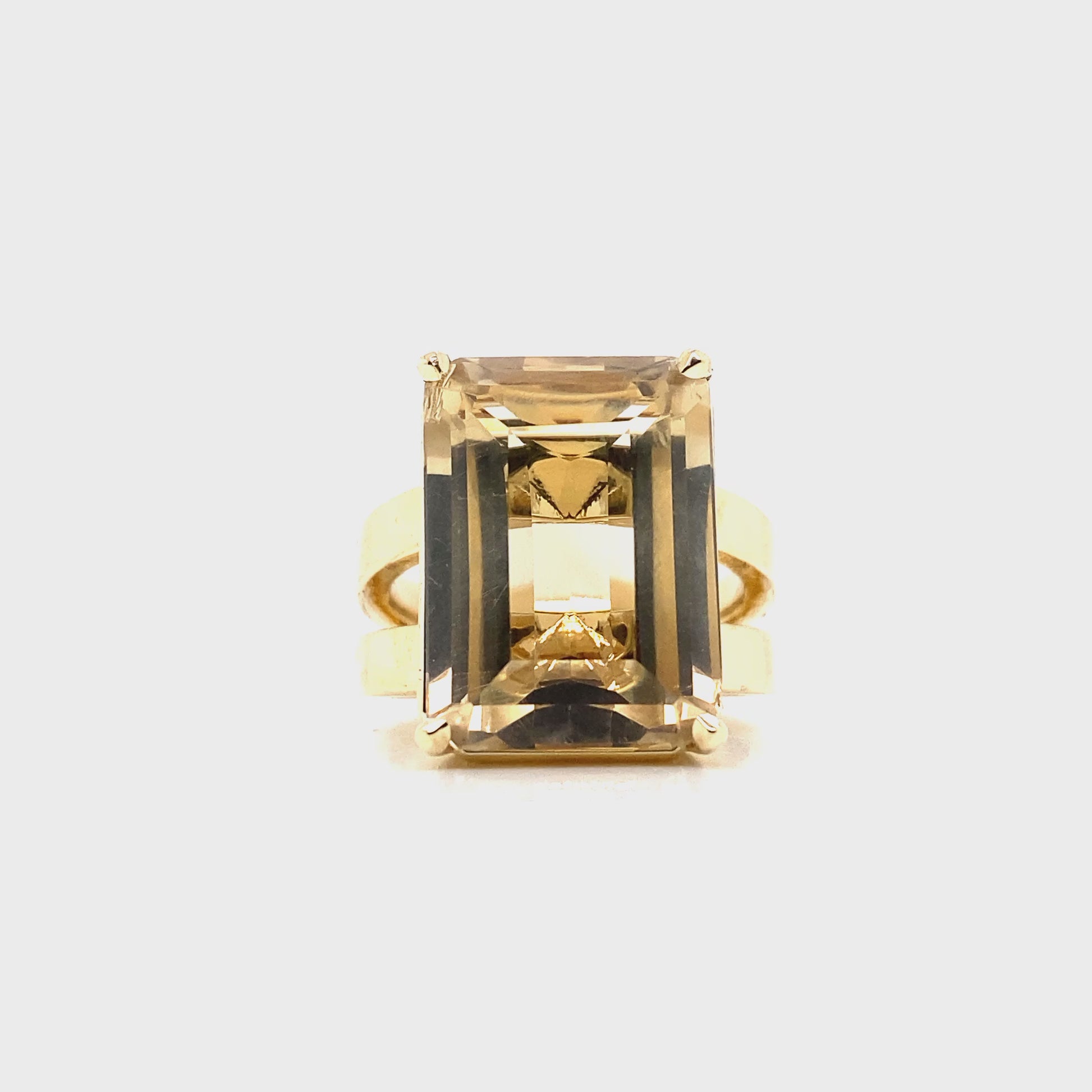 Elevated elegance meets timeless glamour in The Pamela. Handcrafted in rich 18k yellow gold, this bold statement ring features a mesmerizing 12.89 ct emerald-cut brown topaz, known for its warm, smoky brilliance and earthy sophistication. The elongated cut and precision faceting amplify the stone’s natural depth and fire, beautifully framed by a clean double-split shank design.