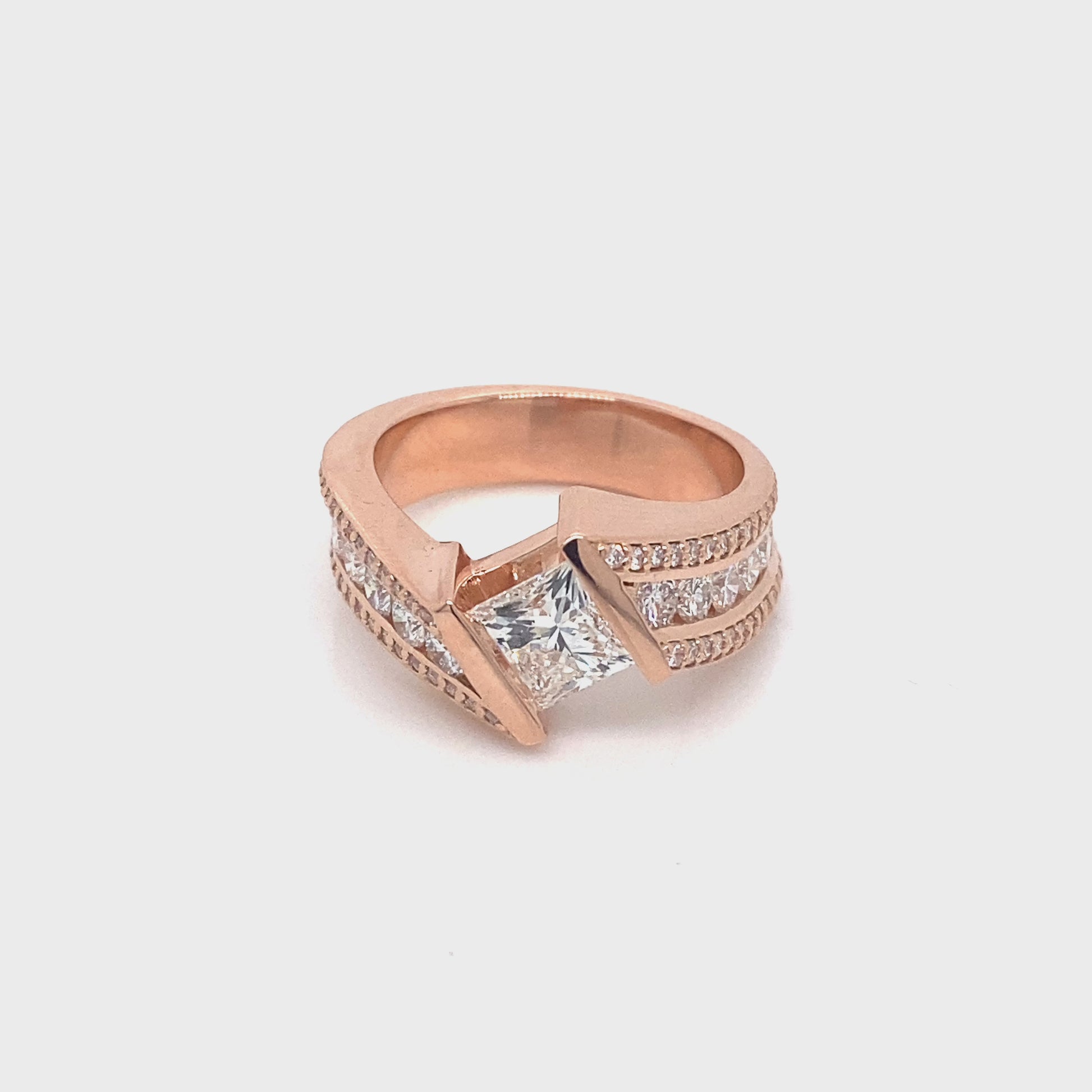Bold meets brilliance in The Rebecca, a sculptural rose gold ring that redefines elegance with its modern, asymmetrical design. At its center lies a striking princess-cut diamond, tension-set between two sweeping, rose gold arms. A trio of diamond rows—two princess-cut channels and a delicate pavé top layer—cascade along the shoulders, catching the light from every angle.