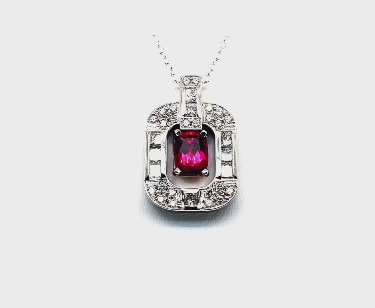 A pendant that exudes grace and vintage glamour, The Valerie is a striking statement of timeless elegance. At its heart lies a rich crimson ruby, bezel-set to showcase its vibrant hue. The radiant center is framed in a geometric Art Deco-inspired halo of baguette and round-cut diamonds, all set in luminous 14K white gold. The elongated silhouette of the design brings a sophisticated edge, making it an exquisite choice for those who appreciate bold beauty with classic influence.